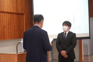 式では社員1人1人に辞令を交付後。